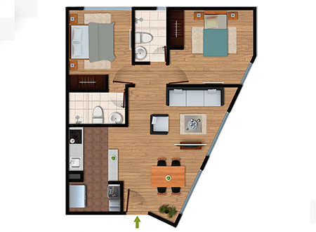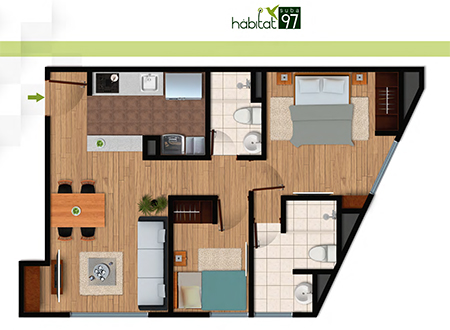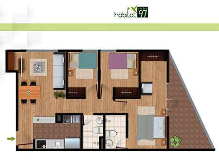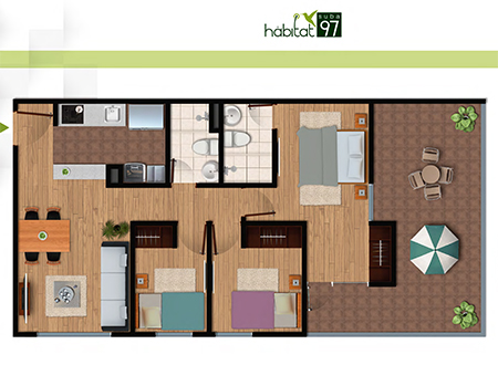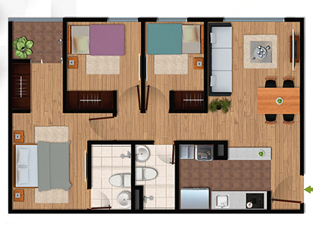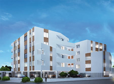 54 Unidades de vivienda distribuidos en tres torres con apartamentos desde 43.72 m2 hasta 61.17 m2. Más áreas de terrazas para algunos apartamentos. Las unidades de vivienda constan de dos y tres aclobas, uno y dos baños, sala comedor, cocina, zona de labores y parqueadero.